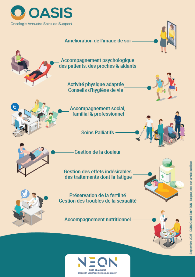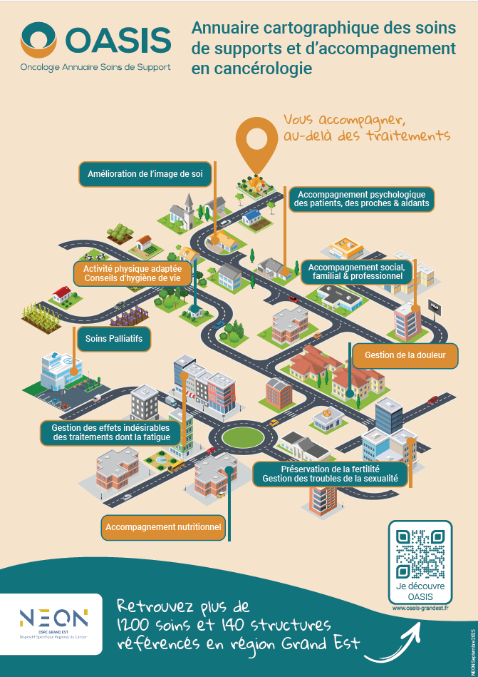 Dans cette dynamique, le DSRC Grand Est NEON met à disposition OASIS, l'annuaire régional des soins de support en cancérologie. Accessible en ligne, OASIS a été développé en étroite collaboration avec les acteurs du territoire afin de faciliter l'information et l'orientation des patients et des professionnels vers les ressources de proximité disponibles.