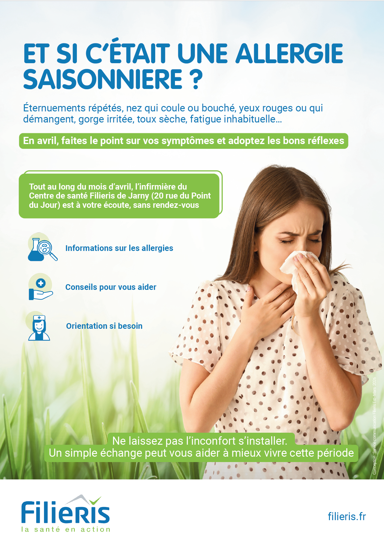 L'allergie peut bénéficier de mesures de prévention et de soins. Pour cela, n'hésitez pas à prendre contact avec l'infirmière du Centre de santé Filiéris de Jarny, tout au long du mois d'avril, ou demandez conseil à votre pharmacien/ consultez votre médecin.